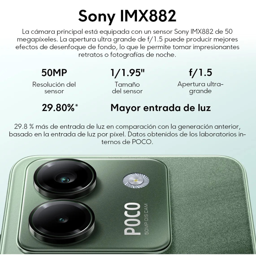 POCO M7 Pro 5G Potencia y Precisión Experimenta un rendimiento ultrarrápido con el procesador 5G Dimensity 7025-Ultra, un innovador procesador de 6nm diseñado para velocidad y eficiencia. Con velocidades de CPU de hasta 2.5GHz y una arquitectura de ocho núcleos, el POCO M7 Pro 5G ofrece multitarea fluida, juegos sin interrupciones y una capacidad de respuesta de siguiente nivel. Sumérgete en impresionantes visuales con una pantalla AMOLED FHD+ de 120Hz. Con tecnología de cuidado ocular y tasas de refresco ultra suaves, cada desplazamiento, toque y transmisión es un deleite visual, cristalino y fácil para los ojos. Captura cada detalle con la cámara Sony de 50MP con OIS (Estabilización Óptica de Imagen) para tomas nítidas y estables, incluso en movimiento. ¿Lluvia o polvo? No hay problema. El M7 Pro 5G cuenta con resistencia al agua y al polvo IP64, brindándote protección de nivel insignia para una durabilidad diaria. Ya sea que estés jugando, creando o capturando momentos de la vida, el POCO M7 Pro 5G está diseñado para afrontar todo de manera fluida, eficiente y confiable.